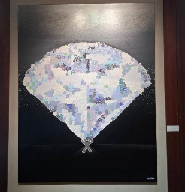 這些擁有誇張表情與變形身體的虛構角色,雖然性格完全不同,卻是平等共存的。他們帶著稚氣,雖不使用相同的語言,卻能在作品中自然地交流、共生。「想將快樂的世界留給後世」是我持續創作的理由。不輕視每個人擁有的才華,尊重彼此的差異,這樣的世界對我而言是理想的烏托邦,也賦予我勇氣與希望。