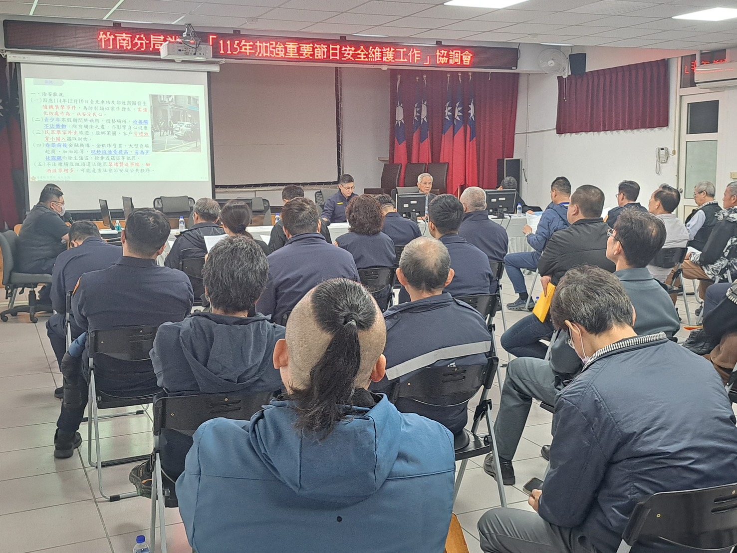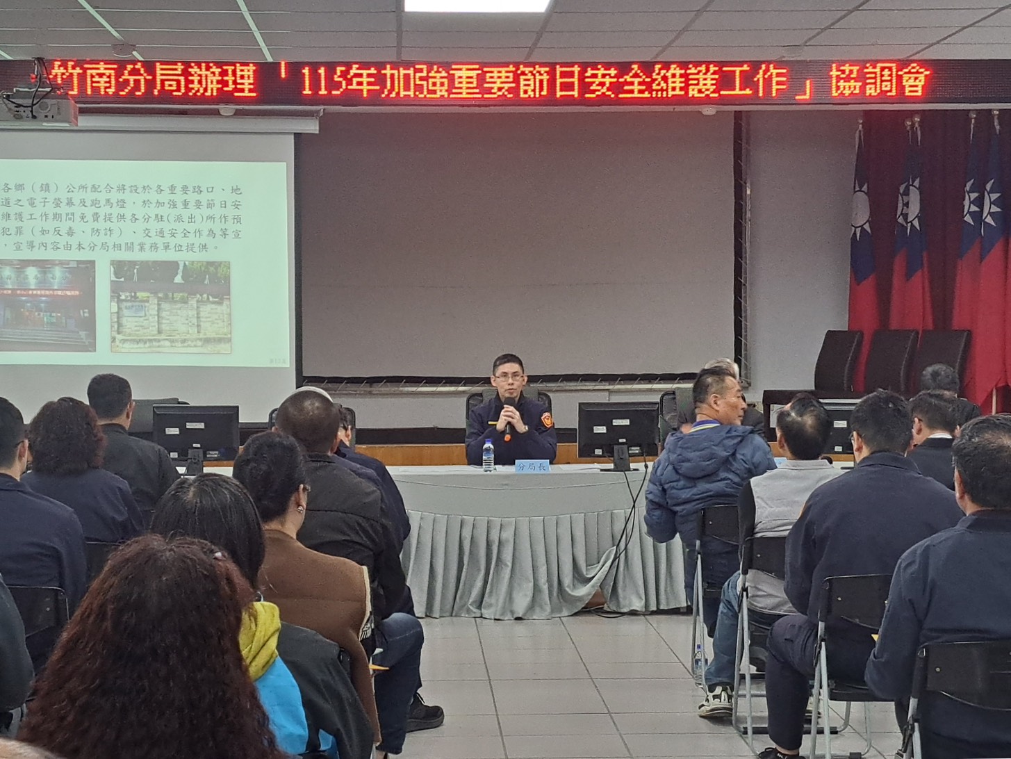 竹南警分局於1月27日下午在分局4樓禮堂召開工作協調會,由分局長陳俞佐主持,邀集轄內各鄉(鎮)公所、學校、金融機構及義警、義交、民防、守望相助隊與志工等單位與會,就治安維護、交通疏導及為民服務等重點工作進行整體規劃與分工。