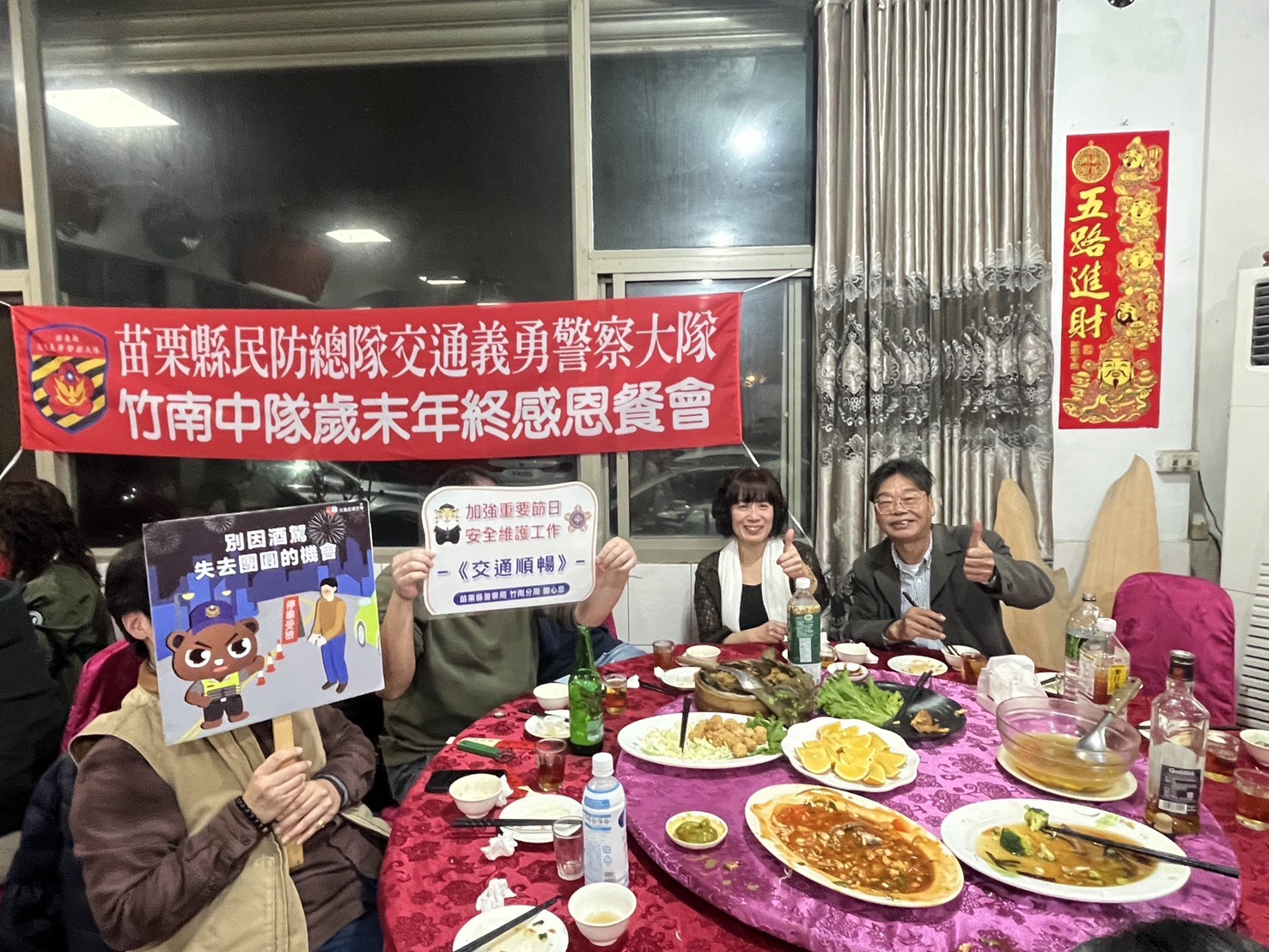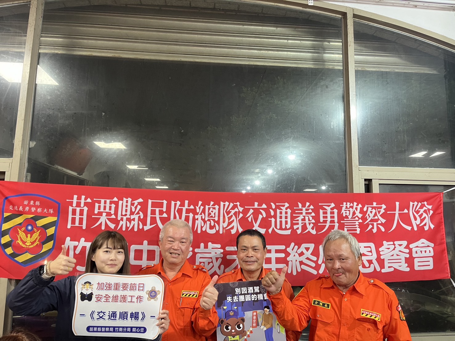 此外,為感謝交通義警一年來協助交通疏導與勤務支援的辛勞,竹南交通義警中隊日前舉辦尾牙感恩餐敘,並結合竹南警分局進行交通安全宣導。警方藉此向義交夥伴說明115年度重要節日安全維護工作期程,並針對酒後駕車防制、行人路權觀念及春節期間國道三號高乘載管制等重點事項加強宣導,期盼透過義交協勤力量,將正確交通觀念深入社區。
