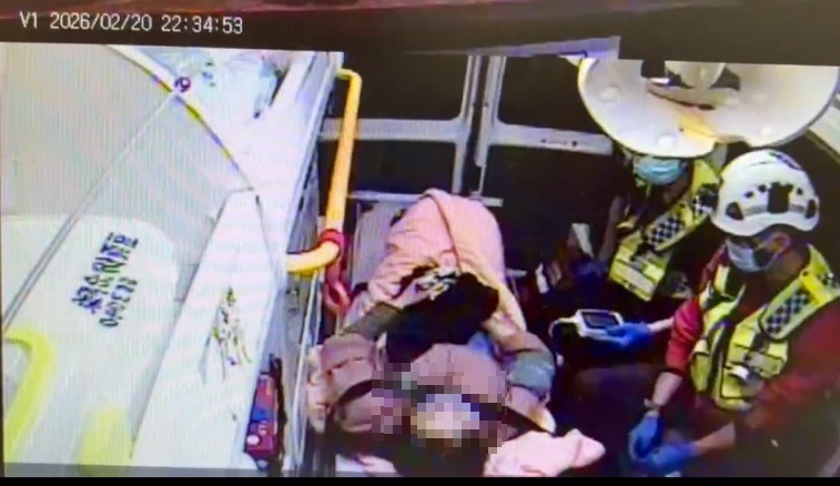 消防隊員將馬桶產子的產婦及新生兒送醫。翻攝畫面