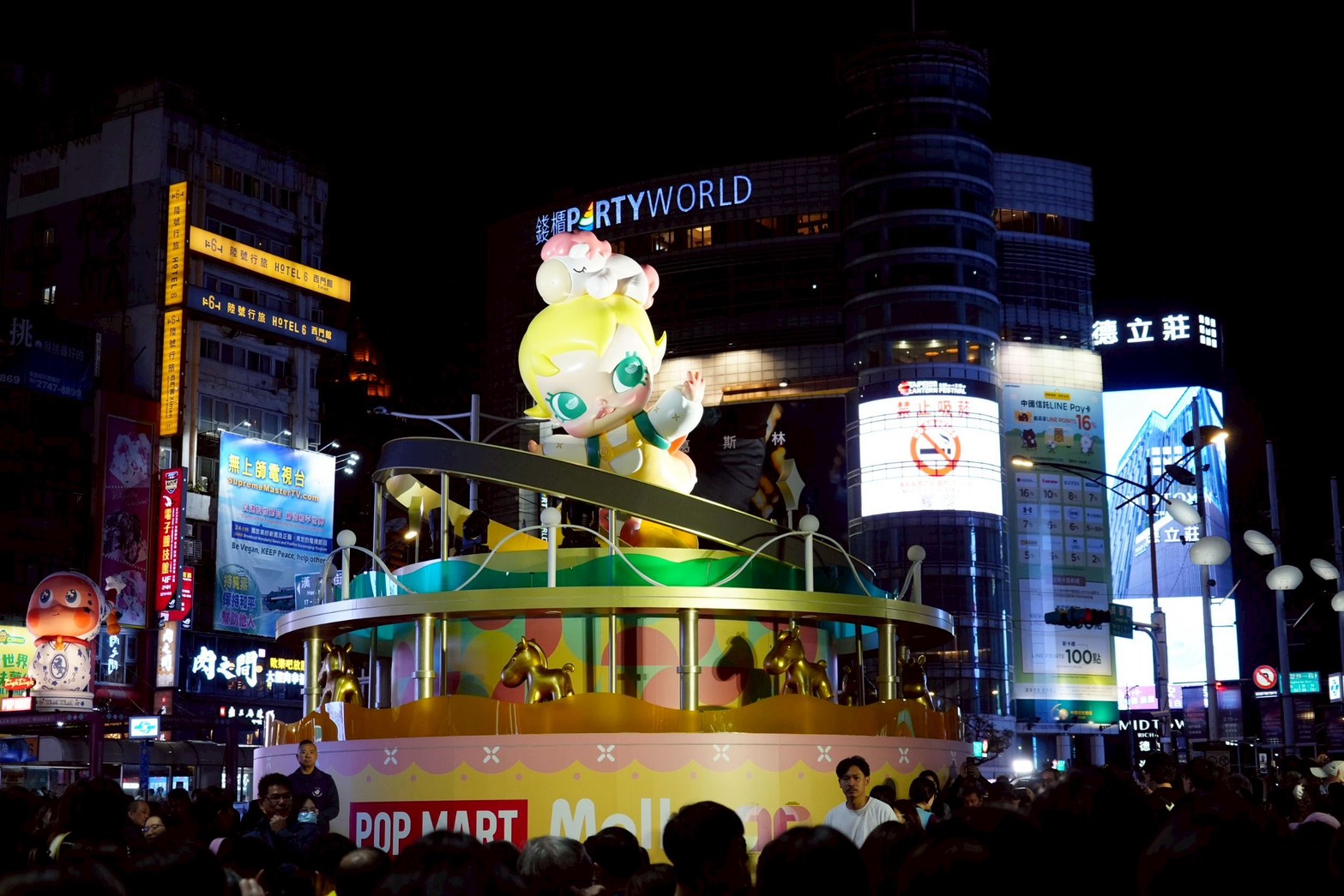 其中,西門主燈「Baby Molly」高達八公尺,在環形跑馬燈與二十組特效燈飾包覆下,白天俏皮明亮,夜晚則在霧色街景中呈現夢幻光芒。展區也集結 LABUBU、SKULLPANDA、DIMOO、Hirono 小野與星星人等角色,彷彿讓西門町成為一座潮流角色的聚會廣場。