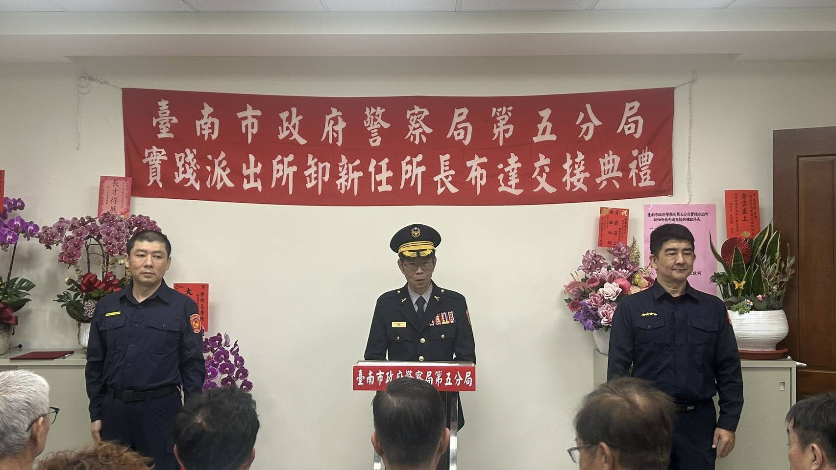 臺南市政府警察局第五分局偵查隊偵查員徐榮隆,長年投入刑事偵查工作,辦案經驗豐富、績效卓著,深獲各界肯定,今(3)日正式接任實踐派出所所長一職,從專責重大刑案偵辦的刑事幹才,轉換跑道投入基層派出所領導工作,徐榮隆幽默戲稱被改調制服。