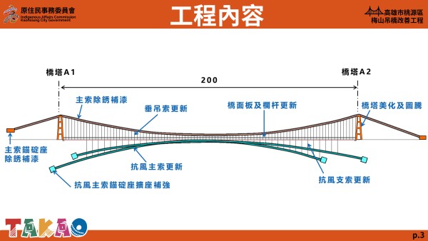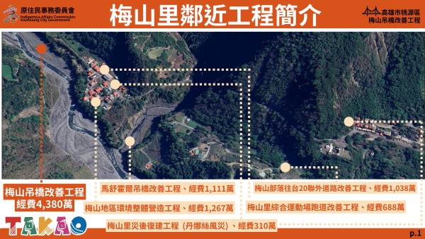 中央原民會副主委谷縱·喀勒芳安表示,針對丹娜絲颱風特別預算,中央挹注高雄三原區9.7億,其中桃源區就達5.8億、共15項工程,梅山吊橋復建工程的4380萬就是其中之一。感謝原民立委及議員為桃源區居民爭取部落需求,讓中央原民會有機會與高雄市政府一起改善部落環境與建設。