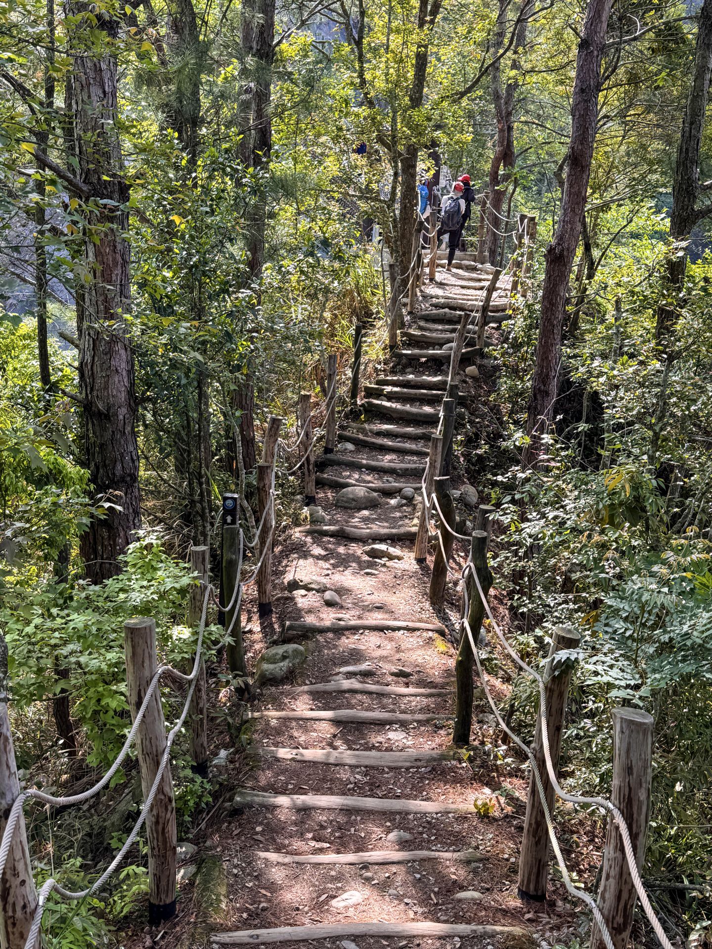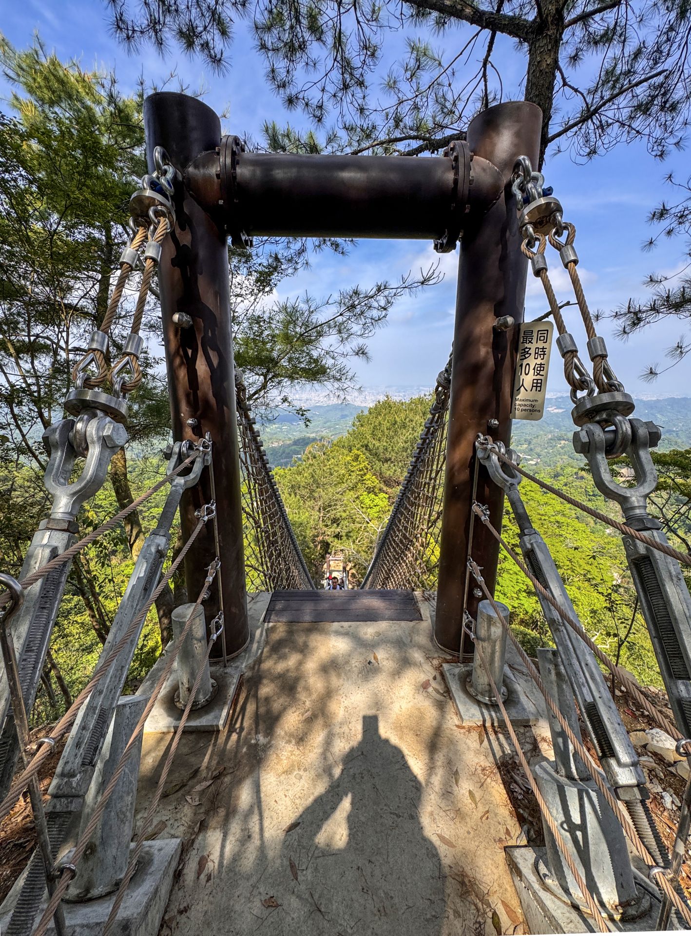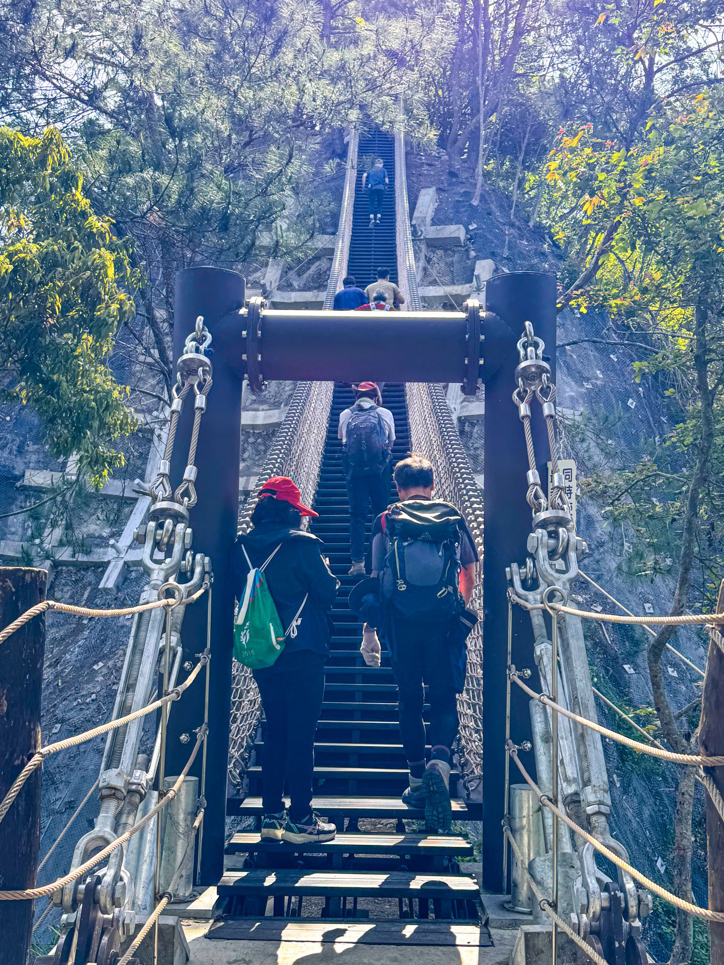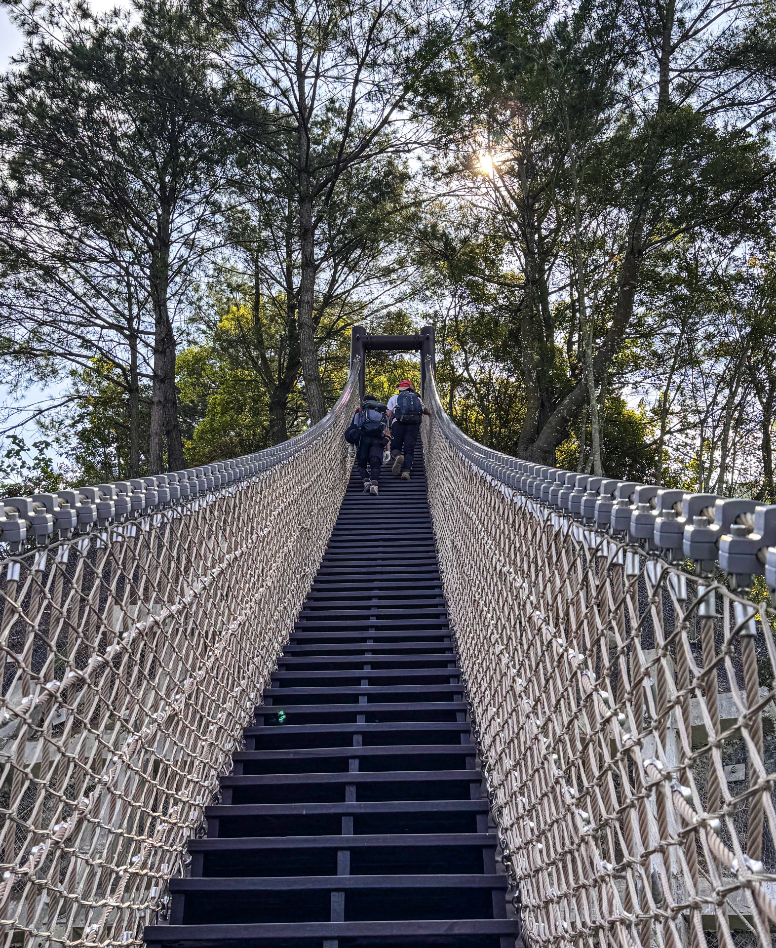 • 視覺震撼: 橋面隨地勢起伏攀升,兩側設有細密的繩網護欄,腳下的木板路徑彷彿在半空中延展。