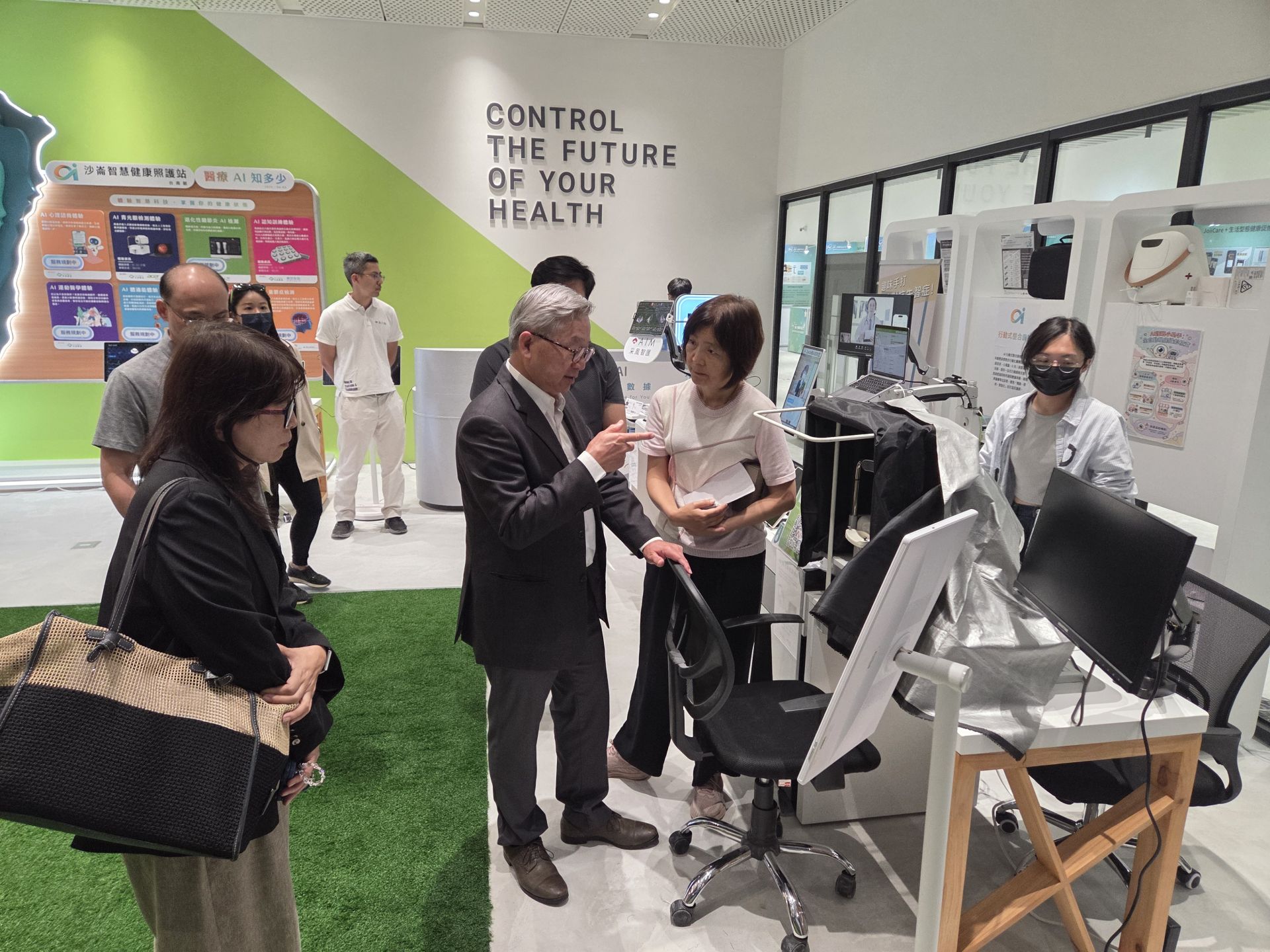 照護站除常設健康量測服務外,也展示多項智慧健康科技設備,包括在宅醫療、行動照護及人工智能醫療檢測應用,例如透過眼底影像輔助檢測青光眼、糖尿病視網膜病變及年齡性黃斑部病變等。現場也設有預防失智的智能訓練互動設備,讓民眾以體驗方式了解智慧科技在健康照護上的應用。部分設備需由醫事人員操作,活動期間並由專業驗光師協助進行眼底影像檢測示範。